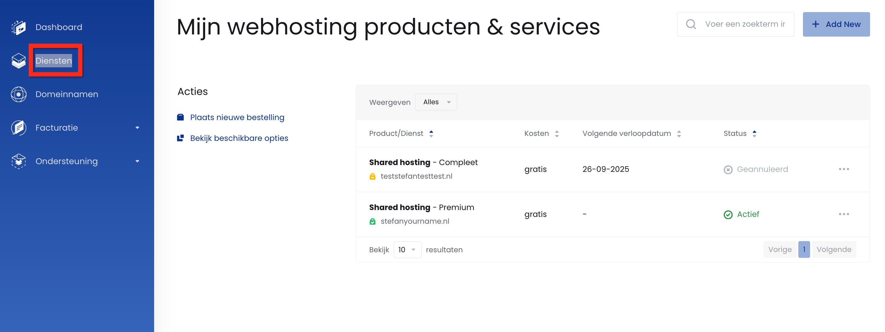 Klik in het linkermenu op Diensten