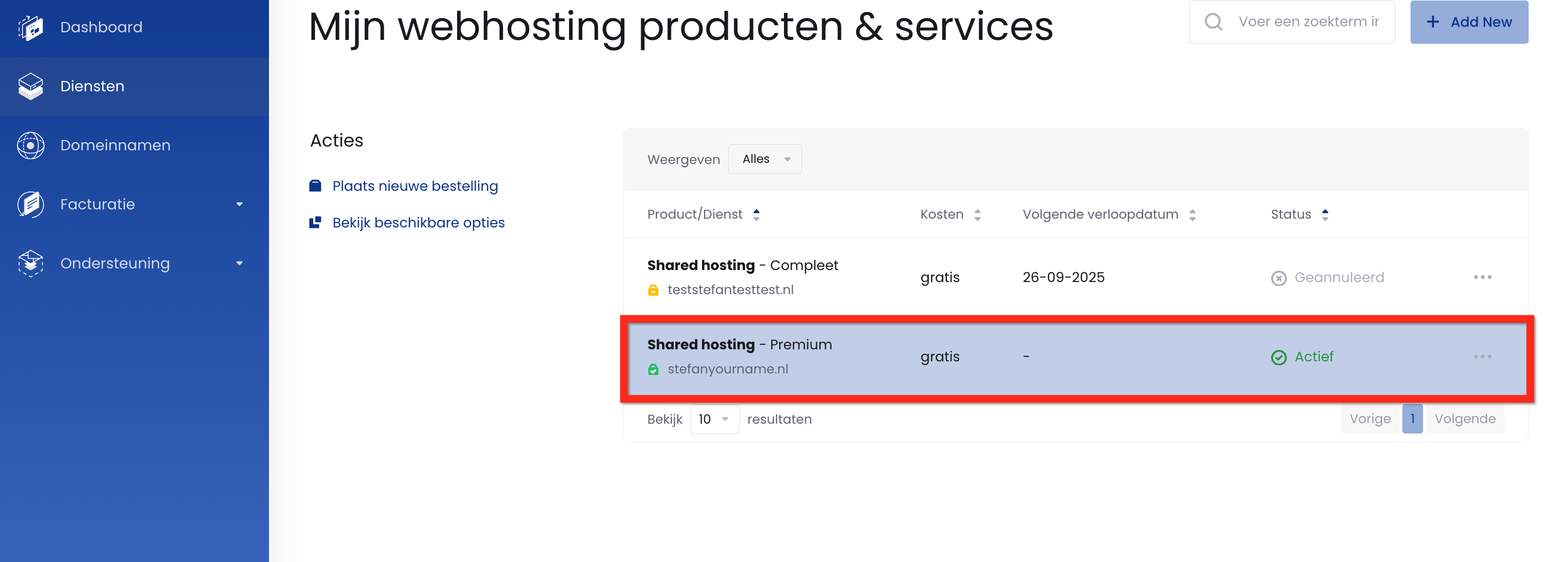 4. Klik op het hostingpakket dat hoort bij het domein waarvoor u een e-mailadres wilt aanmaken