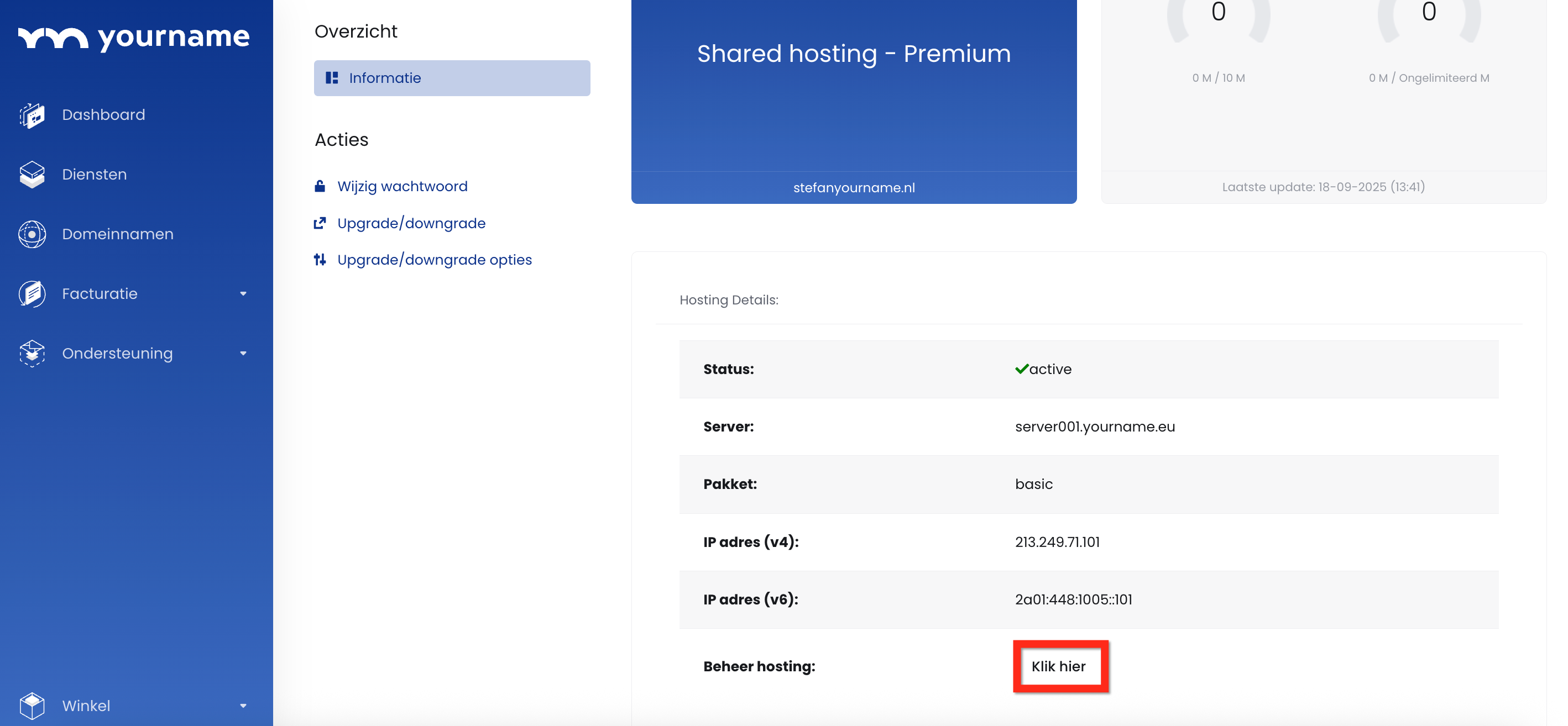 5. Scroll naar beneden en klik op Klik hier achter Beheer hosting