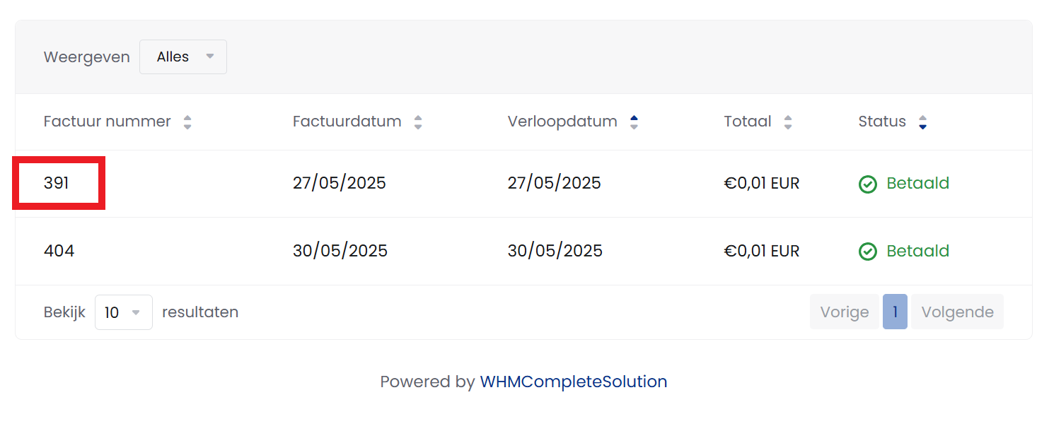 U ziet hier een overzicht van uw facturen inclusief de status, zoals Betaald of Onbetaald.