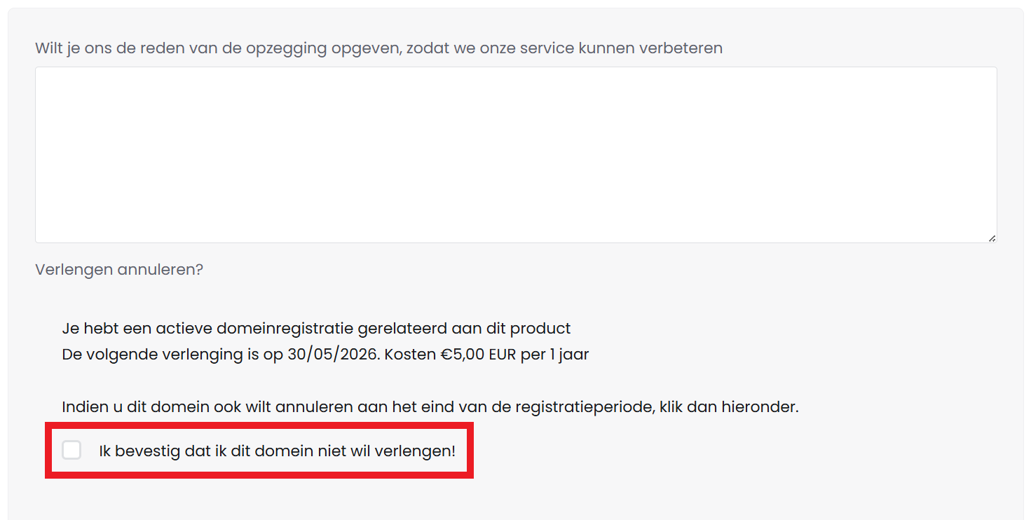 Is er een domeinnaam gekoppeld aan de dienst en wilt u deze ook opzeggen? Selecteer dan de optie Ik bevestig dat ik dit domein niet wil verlengen!