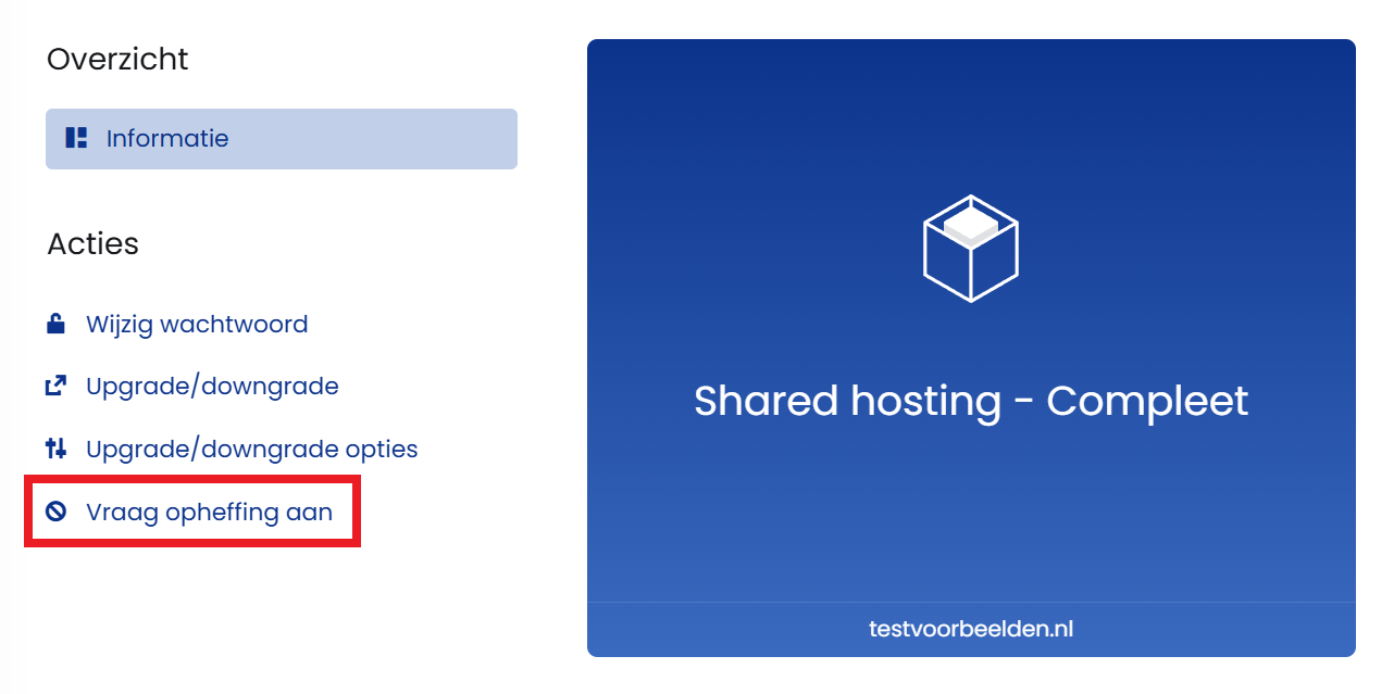 - Hostingdiensten: bij het opzeggen van een hostingdienst worden gekoppelde diensten zoals e-mail en databases ook stopgezet. Zorg dat u een back-up maakt van alle belangrijke gegevens voordat u opzegt.